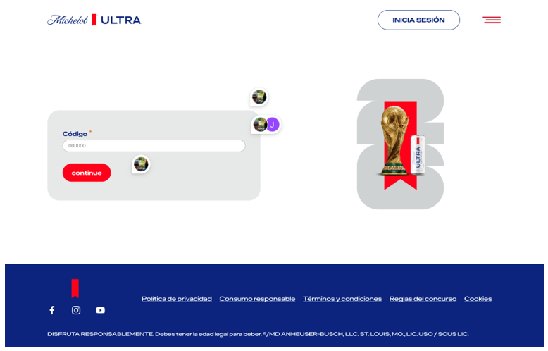 Una vez el participante cuente con un código alfanumérico específico de participación obtenido por alguno de los dos (2) medios mencionados anteriormente, deberá dirigirse al sitio web oficial de Michelob Ultra (https://www.michelobsuperioraccess.com/ donde, quien desee participar, deberá aceptar la mayoría de edad legal en Colombia (tener más de 18 años) y presionar el botón "SÍ". Adicionalmente, en la lista desplegable “País”, el participante deberá seleccionar obligatoriamente “COLOMBIA”. De lo contrario, su participación no será tenida en cuenta.