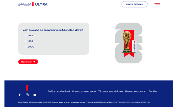 A continuación, el participante deberá responder correctamente dos (2) preguntas de selección múltiplecorrespondientes a una trivia relacionada con la marca Michelob Ultra, las cuales no estarán sujetas a un límite de tiempo. Una vez seleccionada la respuesta a la primera pregunta, el participante deberá presionar el botón “CONTINUAR” para avanzar a la siguiente pantalla y responder la segunda pregunta. Posteriormente, una vez respondidas ambas preguntas, el participante deberá presionar el botón “FINALIZAR”, acción mediante la cual se dará por concluida la participación en la trivia.