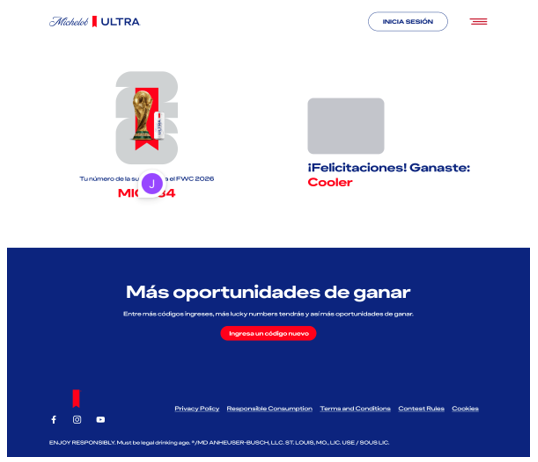 Participación por códigos alfanuméricos específicos de participación recibidos en activaciones que realizará la marca Michelob Ultra en supermercados y puntos de venta a nivel nacional, durante la vigencia de la Actividad.