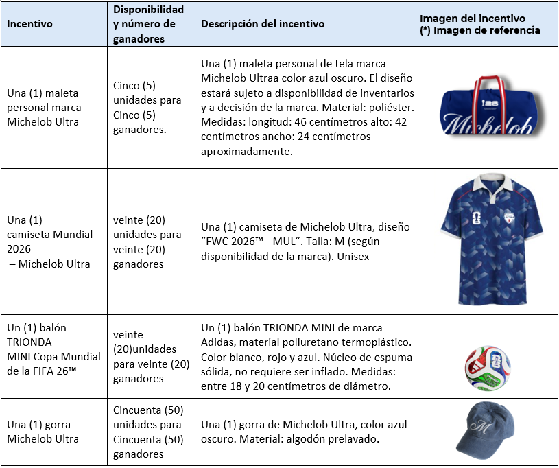 “FIFA WORLD CUP (FWC 2026™) - MICHELOB ULTRA COLOMBIA” (en adelante la “Actividad”), tiene como objetivo premiar a una (1) persona natural la cual será acreedora del “Incentivo mayor” que sea mayor de edad, que realice compras de mínimo un (1) SixPack de Michelob Ultra Botella 330mL o un (1) SixPack de Michelob Ultra Lata 269mL, y que, durante los meses de vigencia de la Actividad, esto es, del dieciséis (16) de febrero de 2026 al veinte (20) de mayo de 2026, cumpla las condiciones aquí descritas para tener la posibilidad de ser el seleccionado como posible ganador de los incentivos de esta actividad.