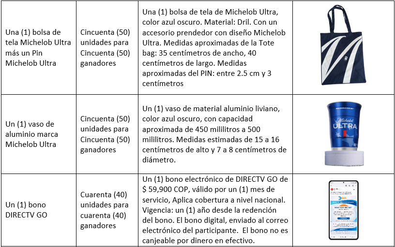 Para mayor información sobre la promoción, condiciones y requisitos para la entrega de los premios y cantidad de premios disponibles, ingresar a https://www.michelobultra.com.co/ y revisar los términos y condiciones o comunicarse en Bogotá al (601) 275 5505 y en el resto del país al 018000-526555